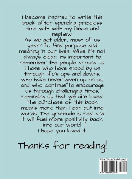 I became inspired to write this book after spending priceless time with with my niece and nephew. As we get older, most of us yearn to find purpose and meaning in our lives. While it's not always clear, its important to remember the people around us. Those who have stood by us through life's ups and downs, who have never given up on us, and who continue to encourage us through challenging times, reminding us that we are loved. The purchase of this book means more than I can put into, words. The gratitude is real and it will fuel more positivity back into our world. I hope you loved it.