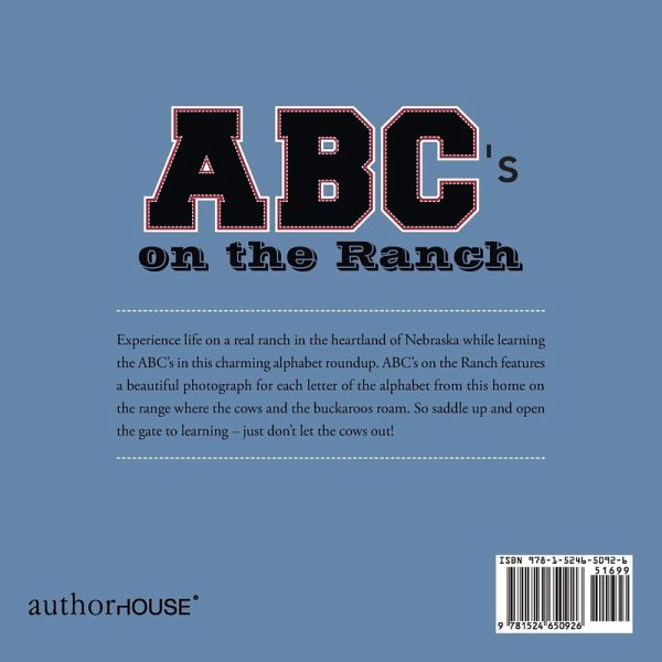Experience life on a real ranch in the heartland of Nebraska while learning the ABCs in this charming alphabet roundup. ABCs on the Ranch features a beautiful photograph for each letter of the alphabet from this home on the range where the cows and the buckaroos roam. So saddle up and open the gate to learning - just don't let the cows out!