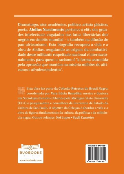 Dramaturgo, ator, acadêmico, político, artista plástico, poeta. Abdias Nascimento pertence à elite dos grandes intelectuais engajados nas lutas libertárias dos negros em âmbito mundial - e também na difusão do pan-africanismo. Esta biografia recupera a vida e a obra de Abdias, resgatando as origens da combatividade desse militante respeitado nacional e internacionalmente, para quem o racismo é "a forma assumida pela opressão que mantém na miséria milhões de africanos e afrodescendentes". Esta obra faz parte da Coleção Retratos do Brasil Negro, coordenada por Vera Lúcia Benedito, mestre e doutora em Sociologia/Estudos Urbanos pela Michigan State University (EUA) e pesquisadora e consultora da Secretaria de Estado da Cultura de São Paulo. O objetivo da Coleção é abordar a vida e a obra de figuras fundamentais da cultura, da política e da militância negra.