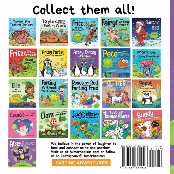 Hi, I'm Abe the ape. I love April Fool's Day, mainly because I like laughing but also because I like farting... Laughing and farting. Farting and laughing. It's all the same to me. In this funny animal book about farts, Abe shares his farts like Silent Safari, Joke Jungle, and Terrible Trickster. The book series, Farting Adventures, celebrates the value of laughter. The Farting Adventures book series is geared to kids and adults ages 0-100: Taylor the Tooting Turkey Frank the Farting Flamingo Artsy Fartsy the Farting Penguin Fairy the Farting Unicorn Farting Without You is Like Roses are Red, And I'm Farting Fred Lucky the Farting Leprechaun Book of Bunny Farts Pete the Pooting Pufferfish and Fritz the Farting Reindeer Makes a perfect gift for April Fool's day for boys and girls.