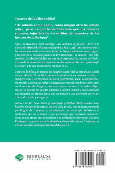 Tesoros de la Hispanidad "He odiado como nadie, como ningún otro ha sabido odiar, pero es que he sentido más que los otros la suprema injusticia de los cariños del mundo y de los favores de la fortuna". Ágil y cautivadora, Abel Sánchez. Una historia de pasión (1917) es la novela de Miguel de Unamuno (España, 1864-1936) que más se ajusta a las convenciones de este canon literario. No por ello es un relato ligero, pues aborda el segundo pecado de la humanidad -la envidia- con total crudeza. La historia bíblica en que está inspirada (la muerte de Abel a manos de su celoso hermano) es un vehículo para entrar en la psicología de Caín y, a la vez, reconocerse un poco en él. Como en la Biblia, el encono de Joaquín hacia Abel se remonta a la más tierna infancia. No es fácil crecer a la sombra de su carisma natural, ni competir con él en las lides del éxito profesional, social o sentimental. Un rosario de afrentas reales e imaginarias van cultivando un odio sordo en el corazón de Joaquín, que aborrece en secreto a su más antiguo amigo. El destino les pondrá adelante a la bella Helena y desencadenará una tragedia en cámara lenta que arrastrará a tres generaciones en un drama de pasión y venganza. Junto a La tía Tula, Amor y pedagogía y Niebla, Abel Sánchez. Una historia de pasión integra el género de la nivola, ficción literaria creada por Miguel de Unamuno y caracterizada por un mayor énfasis en el contenido que en la forma, y por personajes que encarnan pasiones e ideas en una trama que no se detiene en preámbulos. Heredero de Søren Kierkegaard y precursor de la filosofía existencial europea, Unamuno es uno de los principales pensadores del siglo XX. Heir of Søren Kierkegaard and a precursor of continental existentialism, Miguel de Unamuno (Spain, 1864-1936) is one of the main European philosophers of the 20th century, and an outstanding Generation of '98 author. Forever envious of his oldest and more successful friend Abel, Joaquín hates him in secret. When beautiful Helena choses Abel over him, Joaquín's hate grows into obsession and he starts plotting his revenge, with a passion that will ripple through three generations of family members. Inspired in the biblical story of Abel and Cain, Abel Sánchez. Una historia de pasión (1917) is one of Unamuno's most popular books and a Spanish classic. The author's approachable and modern style makes it an excellent choice for anyone seeking to expand their knowledge of the Spanish language.