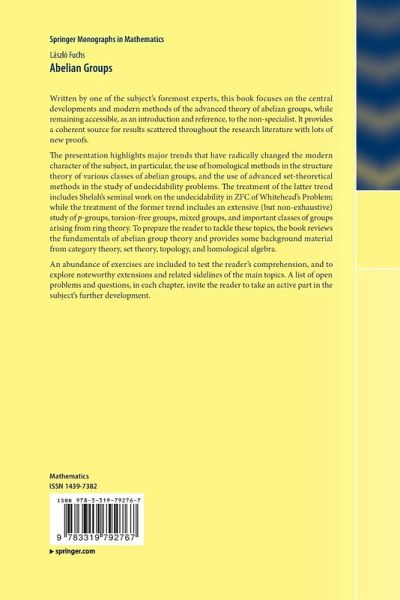 The presentation highlights major trends that have radically changed the modern character of the subject, in particular, the use of homological methods in the structure theory of various classes of abelian groups, and the use of advanced set-theoretical methods in the study of un decidability problems. The treatment of the latter trend includes Shelah's seminal work on the un decidability in ZFC of Whitehead's Problem; while the treatment of the former trend includes an extensive (but non-exhaustive) study of p-groups, torsion-free groups, mixed groups and important classes of groups arising from ring theory. To prepare the reader to tackle these topics, the book reviews the fundamentals of abelian group theory and provides some background material from category theory, set theory, topology and homological algebra.