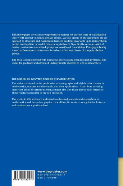 This monograph covers in a comprehensive manner the current state of classification theory with respect to infinite abelian groups. A wide variety of ways to characterise different classes of abelian groups by invariants, isomorphisms and duality principles are discussed.