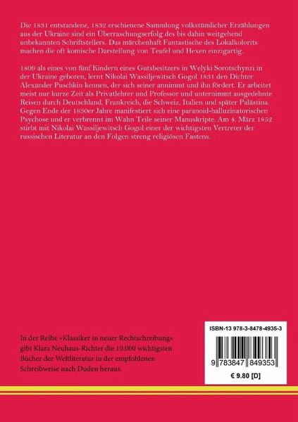 In der Reihe »Klassiker in neuer Rechtschreibung« gibt Klara Neuhaus-Richter die wichtigsten Bücher der Weltliteratur in der empfohlenen Schreibweise nach Duden heraus. Nikolai W. Gogol: Abende auf dem Weiler bei Dikanka. Ukrainische Erzählungen Die 1831 entstandene, 1832 erschienene Sammlung volkstümlicher Erzählungen aus der Ukraine sind ein Überraschungserfolg des bis dahin weitgehend unbekannten Schriftstellers. Das märchenhaft Fantastische des Lokalkolorits machen die oft komische Darstellung von Teufel und Hexen einzigartig. Entstanden 1831/32. Auch erschienen unter den deutschen Titeln »Abende auf dem Vorwerke bei Dikanjka« und »Abende auf dem Gutshof bei Dikanjka«. Hier in der Übersetzung von Alexander Eliasberg, Potsdam, Kiepenheuer, 1921. Inhaltsverzeichnis: Abende auf dem Weiler bei Dikanka. Erster Teil. Vorwort. Der Jahrmarkt zu Ssorotschinzy. Johannisnacht. Die Mainacht oder Die Ertrunkene. Der verlorene Brief. Zweiter Teil. Vorwort. Die Nacht vor Weihnachten. Schreckliche Rache. Iwan Fjodorowitsch Schponjka und sein Tantchen. Der verhexte Ort. Neu herausgegeben und mit einer Biografie des Autors versehen von Klara Neuhaus-Richter, Berlin 2021. Umschlaggestaltung von Rainer Richter unter Verwendung einer Porträtzeichnung von Josefine Weinschrott. Gesetzt aus der Minion Pro, 11 pt. Henricus - Edition Deutsche Klassik GmbH Über den Autor: 1809 als eines von fünf Kindern eines Gutsbesitzers in Welyki Sorotschynzi in der Ukraine geboren, lernt Nikolai Wassiljewitsch Gogol 1831 den Dichter Alexander Puschkin kennen, der sich seiner annimmt und ihn fördert. Er arbeitet meist nur kurze Zeit als Privatlehrer und Professor und unternimmt ausgedehnte Reisen durch Deutschland, Frankreich, die Schweiz, Italien und später Palästina. Gegen Ende der 1830er Jahre manifestiert sich eine paranoid-halluzinatorischen Psychose und er verbrennt im Wahn Teile seiner Manuskripte. Am 4. März 1852 stirbt mit Nikolai Wassiljewitsch Gogol einer der wichtigsten Vertreter der russischen Literatur an den Folgen streng religiösen Fastens.