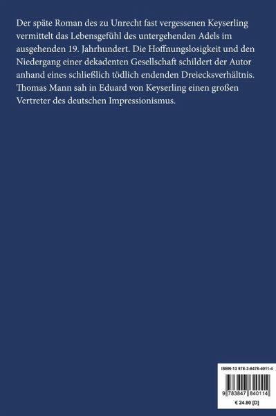 Eduard von Keyserling: Abendliche Häuser. Roman Lesefreundlicher Großdruck in 16-pt-Schrift Der späte Roman des zu Unrecht fast vergessenen Keyserling vermittelt das Lebensgefühl des untergehenden Adels im ausgehenden 19. Jahrhundert. Die Hoffnungslosigkeit und den Niedergang einer dekadenten Gesellschaft schildert der Autor anhand eines schließlich tödlich endenden Dreiecksverhältnis. Thomas Mann sah in Eduard von Keyserling einen großen Vertreter des deutschen Impressionismus. Großformat, 210 x 297 mm Berliner Ausgabe, 2019 Durchgesehener Neusatz mit einer Biographie des Autors bearbeitet und eingerichtet von Theodor Borken Erstdruck in »Neue deutsche Rundschau«, Nr. 25: 1914. Textgrundlage ist die Ausgabe: Eduard von Keyserling: Gesammelte Erzählungen in vier Bänden, Berlin: S. Fischer, 1922. Umschlaggestaltung von Thomas Schultz-Overhage unter Verwendung des Bildes: Adolph Menzel, Hausecke bei Mondschein, 1883. Gesetzt aus der Minion Pro, 16 pt.