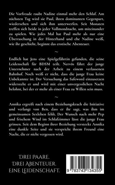Die Vorfreude raubt Nadine einmal mehr den Schlaf. Am nächsten Tag wird sie Paul, ihren dominanten Gegenpart, wiedersehen und sich ihm unterwerfen. Seit Monaten treffen sich beide in jeder Vollmondnacht, um miteinander zu spielen. Wie jedes Mal hat Paul mehr als nur eine Überraschung in der Hinterhand und ehe Nadine weiß, wie ihr geschieht, beginnt das erotische Abenteuer.Endlich hat Jens eine Spielgefährtin gefunden, die seine Leidenschaft für BDSM teilt. Nervös fährt der junge Unternehmer nach der Arbeit zu einem verlassenen Bahnhof. Noch weiß er nicht, dass die junge Frau keine Unbekannte ist. Der Versuchung das Safeword einzusetzen widersteht er und wird mit einer unvergesslichen Nacht belohnt, bei der er mehr als einer Frau zu Willen sein muss.Annika ergreift nach einem Beziehungskrach die Initiative und verlangt von Ben, dass er ihr sagt, was ihm im gemeinsamen Sexleben fehlt. Der Wunsch nach mehr Pep und frischem Wind im Schlafzimmer lässt die junge Frau grinsen. Seit dem Beginn ihrer Beziehung versteckt Annika eine dunkle Seite und sie verspricht ihrem Freund eine Nacht, die er nicht vergessen wird.Drei Paare. Drei Abenteuer. Eine Leidenschaft.