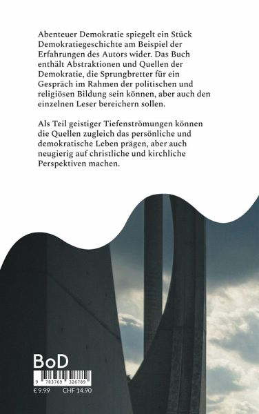 Abenteuer Demokratie spiegelt ein Stück Demokratiegeschichte am Beispiel der Erfahrungen des Autors wider. Das Buch enthält Abstraktionen und Quellen der Demokratie, die Sprungbretter für ein Gespräch im Rahmen der politischen und religiösen Bildung sein können, aber auch den einzelnen Leser bereichern sollen. Als Teil geistiger Tiefenströmungen können die Quellen zugleich das persönliche und demokratische Leben prägen und bewegen, ein gelingendes und sinnerfülltes Leben ermöglichen, aber auch neugierig auf christliche und kirchliche Perspektiven machen.