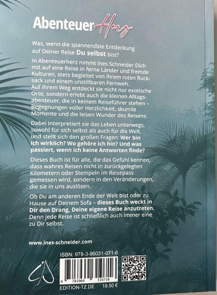 Was, wenn die spannendste Entdeckung auf deiner Reise Du selbst bist? In Abenteuer Herz nimmt Ines Schneider Dich mit au eine Reise in ferne Länder und fremde Kulturen, stets begleitet von ihrem roten Rucksack und einem unstillbaren Fernweh. Auf ihrem Weg entdeckt sie nicht nur exotische Orte, sondern erlebt auch die kleinen Alltagsabenteuer, die in keinem Reiseführer stehen - Begegnungen voller Herzlichkeit, skurrile Momente und die leisen Wunder des Reisens. Dabei interpretiert sie das Leben unterwegs, sowohl für sich selbst als auch für die Welt, und stellt sich den großen Fragen: Wer bin ich wirklich? Wo gehöre ich hin? Und was passiert, wenn ich keine Antworten finde? Dieses Buch ist für alle, die das Gefühl kennen, dass wahres Reisen nicht in zurückgelegten Kilometern oder Stempeln im Reisepass gemessen wird, sondern in den Veränderungen, die sie in uns auslösen. Ob du am anderen Ende der Welt bist oder zu Hause auf Deinem Sofa - dieses Buch weckt in Dir den Drang, Deine eigene Reise anzutreten. Denn jede Reise ist schließlich auch immer eine zu Dir selbst.