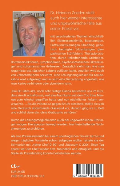 Dr. Heinrich Zeeden stellt auch hier wieder interessante und ungewöhnliche Fälle aus seiner Praxis vor, mit verschiedenen Themen, einschließlich Elektrosensitivität, Besetzungen, Enttraumatisierungen, Shedding, genetisch bedingten Erkrankungen, geopathischen Störfeldern, Therapieresistenz durch linksdrehende Störfelder, Borrelieninfektionen, Lymphödemen, psychosomatischen Erkrankungen und schamanischen Heilweisen. Zusätzlich sieht man, wie man Ärgernisse des täglichen Lebens auflösen kann. Letztlich wird auch von Zahnstörfeldern berichtet, eine Lösungsmöglichkeit für Kreidezähne wird aufgezeigt und es wird eine Betrachtung angestellt, wie man Karies verhindern oder abmildern kann.