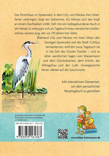 Das Ferienhaus im Spreewald, in dem Lilly und Nikolas ihre Osterferien verbringen, birgt ein Geheimnis. Als Nikolas sich den Kopf an einem Dachbalken stößt, fällt ihm ein ledergebundenes Buch in die Hände. Es entpuppt sich als Tagebuch eines wendischen Müllersohnes namens Juro, der vor 150 Jahren hier lebte.Während Lilly und Nikolas mit ihren Eltern den heutigen Spreewald und die Stadt Cottbus kennenlernen, entführt Juros Tagebuch sie in die Zeit des Fürsten Pückler - und zu alten sorbischen Sagen vom Wassermann und dem Glücksdrachen, dem Irrlicht und der Mittagsfrau, dem Pumphut und den Lutki.Unvergessliche Ferien warten auf die Geschwister.Ferienabenteuer für Kinder und Reiseführer für Familien: die Kinderbuch-Serie "Lilly und Nikolas"Wenn die Geschwister Lilly und Nikolas mit ihren Eltern in den Urlaub fahren, erleben sie die schönsten Abenteuer, staunen über Dinge aus vergangenen Tagen, lösen Rätsel und manchmal auch einen kleinen Kriminalfall. Dabei entdecken sie jedes Mal Sehenswürdigkeiten und Ausflugsziele, die Kindern wirklich Spaß machen. Auf ihren Touren erfahren sie so ganz nebenbei viel über Land und Leute und die Geschichte ihrer Urlaubsregion!- Feriengeschichte voller Spaß, Rätsel und Abenteuer für Kinder von 8 bis 12 Jahren- Spannend und informativ: Urlaubslektüre und Reiseführer in einem Kinderbuch- Zum Selbstlesen oder zum gemeinsamen Lesen in der Familie- Die schönsten Urlaubsziele für Familien und Tipps für Ausflüge mit Kindern- Zoos, Freizeitparks und Museen, die Kinder begeistern- Geeignet für Buchvorstellungen und für die Leseförderung mit ANTOLIN- Kann auch im Heimat- und Sachunterricht in der Grundschule eingesetzt werdenOb Urlaub in Deutschland oder den Nachbarländern, ob Sommerferien am Meer oder Herbsturlaub in den Bergen: Diese Kinderbücher machen Lust, selbst die Koffer zu packen und loszuziehen!