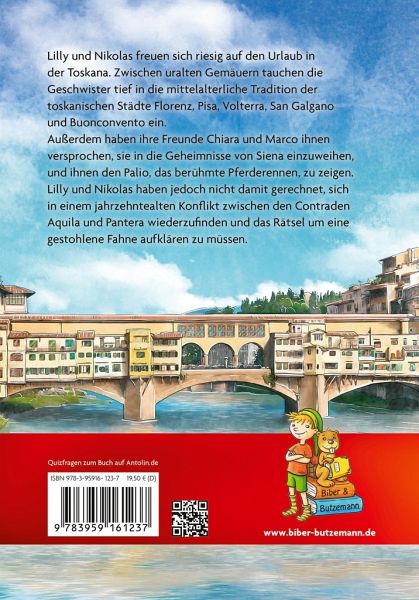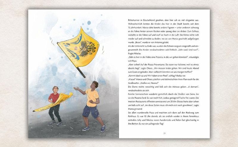 Lilly und Nikolas freuen sich riesig auf den Urlaub in der Toskana. Zwischen uralten Gemäuern tauchen die Geschwister tief in die mittelalterliche Tradition der toskanischen Städte Florenz, Pisa, Volterra, San Galgano und Buonconvento ein. Außerdem haben ihre Freunde Chiara und Marco ihnen versprochen, sie in die Geheimnisse von Siena einzuweihen, und ihnen den Palio, das berühmte Pferderennen zu zeigen. Lilly und Nikolas haben jedoch nicht damit gerechnet, sich in einem jahrzehntealten Konflikt zwischen den Contraden Aquila und Pantera wiederzufinden und das Rätsel um eine gestohlene Fahne aufklären zu müssen.Ferienabenteuer für Kinder und Reiseführer für Familien: die Kinderbuch-Serie "Lilly und Nikolas"Wenn die Geschwister Lilly und Nikolas mit ihren Eltern in den Urlaub fahren, erleben sie die schönsten Abenteuer, staunen über Dinge aus vergangenen Tagen, lösen Rätsel und manchmal auch einen kleinen Kriminalfall. Dabei entdecken sie jedes Mal Sehenswürdigkeiten und Ausflugsziele, die Kindern wirklich Spaß machen. Auf ihren Touren erfahren sie so ganz nebenbei viel über Land und Leute und die Geschichte ihrer Urlaubsregion!- Feriengeschichte voller Spaß, Rätsel und Abenteuer für Kinder- Spannend und informativ: Urlaubslektüre und Reiseführer in einem Kinderbuch- Zum Selbstlesen oder zum gemeinsamen Lesen in der Familie- Die schönsten Urlaubsziele für Familien und Tipps für Ausflüge mit Kindern- Zoos, Freizeitparks und Museen, die Kinder begeistern- Geeignet für Buchvorstellungen und für die Leseförderung mit ANTOLIN- Kann auch im Heimat- und Sachunterricht in der Grundschule eingesetzt werdenOb Urlaub in Deutschland oder den Nachbarländern, ob Sommerferien am Meer oder Herbsturlaub in den Bergen: Diese Kinderbücher machen Lust, selbst die Koffer zu packen und loszuziehen!