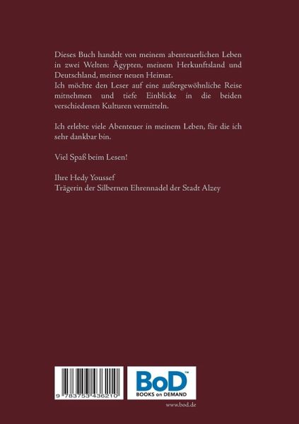 Dieses Buch handelt von meinem abenteuerlichen Leben in zwei Welten: Ägypten, meinem Herkunftsland und Deutschland, meiner neuen Heimat.Ich möchte den Leser auf eine außergewöhnliche Reise mitnehmen und tiefe Einblicke in die beiden verschiedenen Kulturen vermitteln.Ich erlebte viele Abenteuer in meinem Leben, für die ich sehr dankbar bin.Viel Spaß beim Lesen!Ihre Hedy YoussefTrägerin der Silbernen Ehrennadel der Stadt Alzey