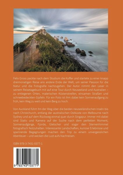 Felix Gross packte nach dem Studium die Koffer und startete zu einer knapp dreimonatigen Reise ans andere Ende der Welt, um seiner Passion für die Natur und die Fotografie nachzugehen. Der Autor nimmt den Leser in seinem Reisetagebuch mit auf eine Tour durch Neuseeland und Australien - zu entlegenen Orten, malerischen Küstenstreifen, einsamen Straßen und schneebedeckten Gipfeln. Für ein Foto ist ihm dabei kein Sonnenaufgang zu früh, kein Weg zu weit und kein Berg zu hoch.Von Auckland führt ihn der Weg über die beiden neuseeländischen Inseln bis nach Christchurch, entlang der australischen Ostküste von Melbourne nach Sydney und auf dem Rückweg einmal quer durch Singapur. Immer mit dabei sind Stativ und Kamera auf der Suche nach dem perfekten Moment, Sonnenaufgänge, Fjorde, Gletscher und sogar den Sternenhimmel fotografisch festzuhalten. Interessante Landschaften, kuriose Erlebnisse und spannende Begegnungen machen den Trip zu einem unvergesslichen Abenteuer - und wecken die Lust aufs Nachreisen.