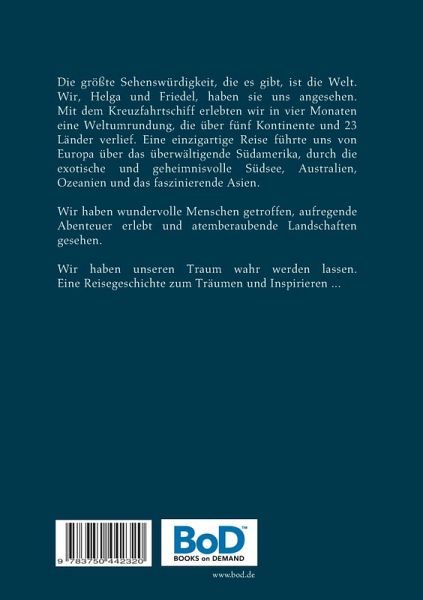 Die größte Sehenswürdigkeit die es gibt ist die Welt.Wir, Helga und Friedel, haben sie uns angesehen. Mit dem Kreuzfahrtschiff erlebten wir in vier Monaten eine Weltumrundung, die über fünf Kontinente und 23 Länder verlief. Eine einzigartige Reise führte uns von Europa über das überwältigende Südamerika, durch die exotische und geheimnisvolle Südsee, Australien, Ozeanien und das faszinierende Asien.Wir haben wundervolle Menschen getroffen, aufregende Abenteuer erlebt und atemberaubende Landschaften gesehen. Wir haben unseren Traum wahr werden lassen.Eine Reisegeschichte zum Träumen und Inspirieren ...