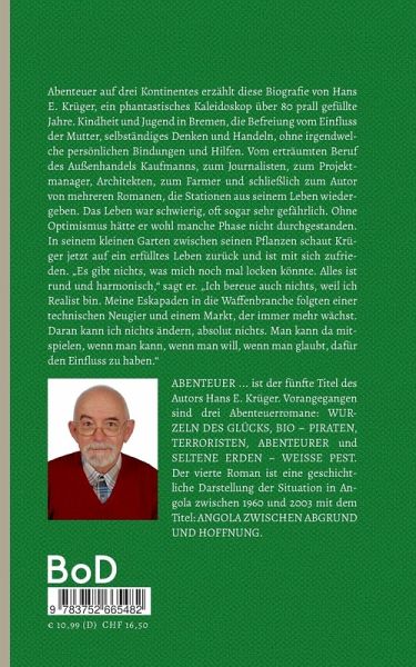 Abenteuer auf drei Kontinentes erzählt diese Biografie von Hans E. Krüger, ein phantastisches Kaleidoskop über 80 prall gefüllte Jahre. Kindheit und Jugend in Bremen, die Befreiung vom Einfluss der Mutter, selbständiges Denken und Handeln, ohne irgendwelche persönlichen Bindungen und Hilfen. Vom erträumten Beruf des Außenhandels Kaufmanns, zum Journalisten, zum Projektmanager, Architekten, zum Farmer und schließlich zum Autor von mehreren Romanen, die Stationen aus seinem Leben wiedergeben. Das Leben war schwierig, oft sogar sehr gefährlich. Ohne Optimismus hätte er wohl manche Phase nicht durchgestanden. In seinem kleinen Garten zwischen seinen Pflanzen schaut Krüger jetzt auf ein erfülltes Leben zurück und ist mit sich zufrieden. "Es gibt nichts, was mich noch mal locken könnte. Alles ist rund und harmonisch," sagt er. "Ich bereue auch nichts, weil ich Realist bin. Meine Eskapaden in die Waffenbranche folgten einer technischen Neugier und einem Markt, der immer mehr wächst. Daran kann ich nichts ändern, absolut nichts. Man kann da mitspielen, wenn man kann, wenn man will, wenn man glaubt, dafür den Einfluss zu haben."