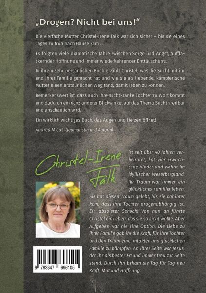 Glückliche, liebevoll aufgewachsene und gut erzogene Kinder tappen ahnungslos in die Drogenfalle. Welches Kind lässt sich warnen, wenn der Gruppendruck stark ist? Im Umgang mit Drogen sind viele einfach zu gutgläubig, unwissend, nichts Böses ahnend und total naiv. Jeder Joint kann eine Drogensucht auslösen. Plötzlich steht das Kind zwischen den Eltern und dem Dealer. Das Kind wird ausgenutzt, erpresst und misshandelt. Aus Angst vor den Folgen vertraut es sich den Eltern nicht an. Statt klug und stark für das Leben zu werden, wurde auch unser Kind drogenabhängig. Unser Leben wurde anstrengend, kompliziert und nervenaufreibend. Das ist ein schwieriges Leiden, zuzusehen, wie das Kind langsam, aber unaufhörlich seinen ganz persönlichen Zusammenbruch erlebt. Eltern kämpfen jahrelang um ihr geliebtes Kind und wissen trotz aller Mühe nicht, ob sie ihr Kind retten können. Was sie wissen ist: es kann tödlich enden. Was wir erlebt haben, soll nicht vergeblich gewesen sein. Unsere Erfahrungen und Erlebnisse sind hilfreich und nützlich. Egal, ob sie positiv oder negativ sind, sie helfen denken und leben. Sie geben betroffenen Menschen Heilung und Trost, Ermutigung und neue Kraft zum Leben. Spannend ist, dass meine Tochter ihr Leben aus ihrer Sicht erzählt.