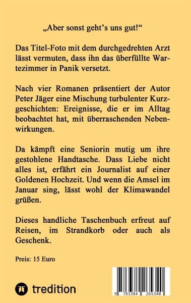 In schwierigen Zeiten ist es fast unmöglich, ein vergnügter Mensch zu sein. Morgens schon, beim Frühstück, überschütten uns die Nachrichten mit Konflikten, die Ängste und Verdruss auslösen.Wie sollen da Heiterkeit oder Optimismus aufkommen?Vor einigen Jahren hatte ich angefangen, heitere Kurzgeschichten zu sammeln. Mit aktuellen Erlebnissen ergänzt, müsste es jetzt gelingen, meinen Lesern gute Laune zu vermitteln.Von "Schlank für Mallorca" bis "Krimi mit der Mimi" reichen die Themen, die an humorvolle Augenblicke im Alltag erinnern.Ich wünsche Ihnen, verehrte Leser, vergnügte Unterhaltung!Peter Jäger