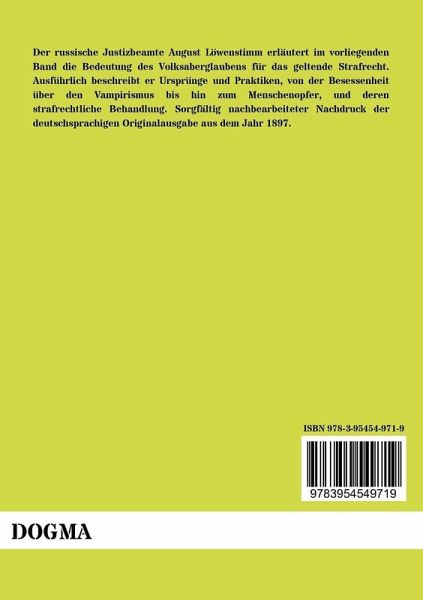 Der russische Justizbeamte August Löwenstimm erläutert im vorliegenden Band die Bedeutung des Volksaberglaubens für das geltende Strafrecht. Ausführlich beschreibt er Ursprünge und Praktiken, von der Besessenheit über den Vampirismus bis hin zum Menschenopfer, und deren strafrechtliche Behandlung. Sorgfältig nachbearbeiteter Nachdruck der deutschsprachigen Originalausgabe aus dem Jahr 1897.