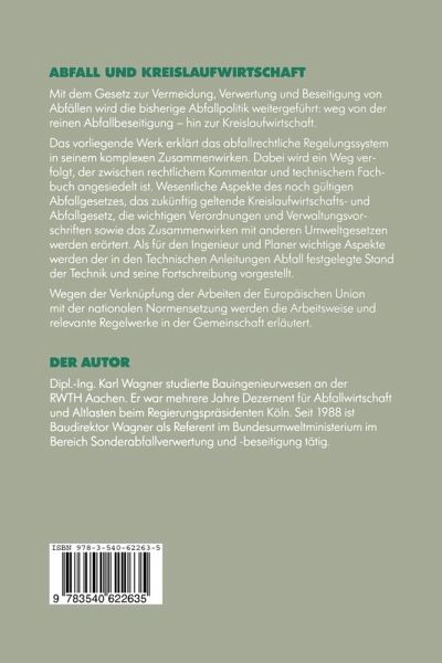 Mit dem Gesetz zur Vermeidung, Verwertung und Beseitigung von Abfällen wird die bisherige Abfallpolitik weitergeführt: weg von der reinen Abfallbeseitigung hin zur Kreislaufwirtschaft. Abfall und Kreislaufwirtschaft erklärt das abfallrechtliche Regelungssystem in seinem komplexen Zusammenwirken. Wesentliche Aspekte des noch gültigen Abfallgesetzes, das zukünftig geltende Kreislaufwirtschafts- und Abfallgesetz, die wichtigen Verordnungen und Verwaltungsvorschriften sowie das Zusammenwirken mit anderen Umweltgesetzen werden erörtert. Wegen der Verknüpfung der Arbeiten der EU mit der nationalen Normensetzung werden die Arbeitsweise und relevante Regelwerke in der Gemeinschaft erläutert.
