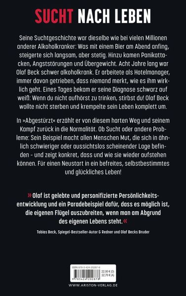 Seine Suchtgeschichte war dieselbe wie bei vielen Millionen anderer Alkoholkranker: Was mit einem Bier am Abend anfing, steigerte sich langsam, aber stetig. Hinzu kamen Panikattacken, Angststörungen und Übergewicht. Acht Jahre lang war Olaf Beck schwer alkoholkrank. Er arbeitete als Hotelmanager, immer davon getrieben, dass niemand merkt, wie es ihm wirklich geht. Eines Tages bekam er seine Diagnose schwarz auf weiß: Wenn du nicht aufhörst zu trinken, stirbst du! Olaf Beck wollte nicht sterben, sondern leben, und krempelte sein Leben komplett um. In »Abgestürzt« erzählt er von diesem harten Weg und seinem Kampf zurück in die Normalität. Ob Sucht oder andere Probleme: Sein Beispiel macht allen Menschen Mut, die sich in ähnlich schwieriger oder aussichtslos scheinender Lage befinden - und zeigt konkret, dass und wie sie wieder aufstehen können. Für einen Neustart in ein befreites, selbstbestimmtes und glückliches Leben!