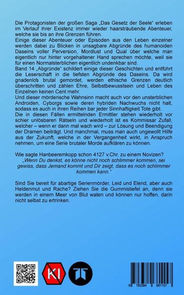 Die Protagonisten der großen Saga "Das Gesetz der Seele" erleben im Verlauf ihrer Existenz immer wieder haarsträubende Abenteuer, welche sie bis an ihre Grenzen führen.Einige dieser Abenteuer oder Episoden aus den Leben einzelner werden dabei zu Blicken in unsagbare Abgründe des humanoiden Daseins voller Perversion, Mordlust und Qual über welche man eigentlich nur hinter vorgehaltener Hand sprechen möchte, weil sie für einen Normalsterblichen eigentlich undenkbar sind.Band 14 "Abgründe" schildert einige dieser Geschichten und entführt die Leserschaft in die tiefsten Abgründe des Daseins. Da wird gnadenlos brutal gemordet, werden ethische Grenzen deutlich überschritten und zählen Ehre, Selbstbewusstsein und Leben des Einzelnen keinen Cent mehr.Und dieser mörderische Wahnsinn macht auch vor den unsterblichen Androiden, Cyborgs sowie deren hybriden Nachwuchs nicht halt, sodass es auch in ihren Reihen bar jeder Sinnhaftigkeit Tote gibt.Die in diesen Fällen ermittelnden Ermittler stehen wiederholt vor schier unlösbaren Rätseln und wiederholt ist es Kommissar Zufall, welcher - wenn er dann mal wach wird - zur Lösung und Beendigung der Dramen beiträgt. Und manchmal, muss man auch ungewollt Hilfe aus der Zukunft, welche in der Vergangenheit wirkt, in Anspruch nehmen, um eine Serie brutaler Morde aufklären zu können.Wie sagte Hanbeeremkopp schon 4127 v.Chr. zu einem Novizen?"Wenn Du denkst, es könne nicht noch schlimmer kommen, sei gewiss, dass Jemand kommt und Dir zeigt, dass es noch schlimmer kommen kann."Sind Sie bereit für abartige Serienmörder, Leid und Elend, aber auch Heldenmut und Rache? Ziehen Sie die Gummistiefel an, denn sie werden in einem Meer von Blut waten und können nur hoffen, darin nicht selbst zu ertrinken.