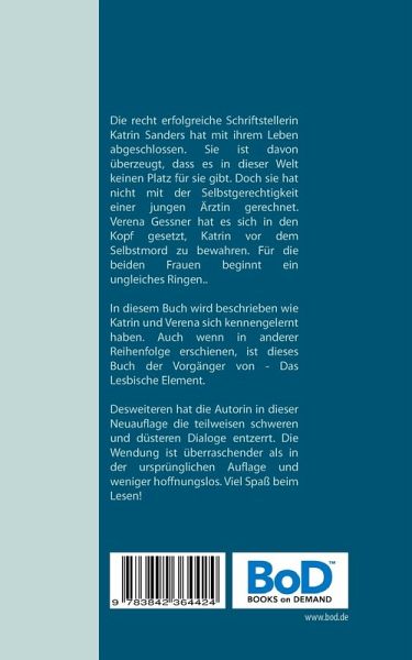Die recht erfolgreiche Schriftstellerin Katrin Sanders hat mit ihrem Leben abgeschlossen. Sie ist davon überzeugt, dass es in dieser Welt keinen Platz für sie gibt. Doch sie hat nicht mit der Selbstgerechtigkeit einer jungen Ärztin gerechnet. Verena Gessner hat es sich in den Kopf gesetzt, Katrin vor dem Selbstmord zu bewahren. Für die beiden Frauen beginnt ein ungleiches Ringen.. In diesem Buch wird beschrieben wie Katrin und Verena sich kennengelernt haben. Auch wenn in anderer Reihenfolge erschienen, ist dieses Buch der Vorgänger von - Das Lesbische Element. Desweiteren hat die Autorin in dieser Neuauflage die teilweisen schweren und düsteren Dialoge entzerrt. Die Wendung ist überraschender als in der ursprünglichen Auflage und weniger hoffnungslos. Viel Spaß beim Lesen!