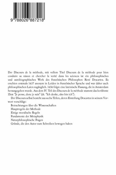 Der Discours de la méthode, mit vollem Titel Discours de la méthode pour bien conduire sa raison et chercher la verité dans les sciences ist ein philosophisches und autobiographisches Werk des französischen Philosophen René Descartes. Es erschien erstmals 1637 anonym in Leiden in französischer Sprache und war daher auch philosophischen Laien zugänglich. 1656 folgte eine lateinische Fassung, die in Amsterdam herausgegeben wurde. Aus dem IV. Teil des Discours de la méthode stammt das berühmte Zitat "Je pense, donc je suis" (dt. "Ich denke, also bin ich"). Der Discours selbst besteht aus sechs Teilen, deren Einteilung Descartes in seinem Vorwort vorschlägt: Betrachtungen über die Wissenschaften Hauptregeln der Methode Einige moralische Regeln Fundamente der Metaphysik Naturphilosophische Fragen Gründe, die den Autor zum Schreiben bewogen haben