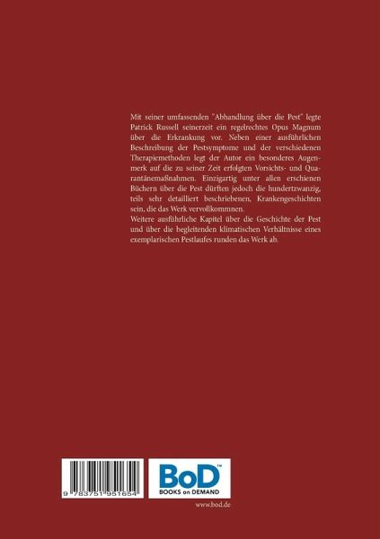 Mit seiner umfangreichen "Abhandlung über die Pest" legte Patrick Russell seinerzeit ein regelrechtes Opus Magnum über die Erkrankung vor. Neben einer ausführlichen Beschreibung der Pestsymptome und der verschiedenen Therapiemethoden legt der Autor ein besonderes Augenmerk auf die zu seiner Zeit erfolgten Vorsichts- und Quarantänemaßnahmen. Einzigartig unter allen erschienenen Büchern über die Pest dürften jedoch hundertzwanzig teils sehr detailliert beschriebene Krankengeschichten sein, die das Werk vervollkommnen.Weitere ausführliche Kapitel über die Geschichte der Pest und über die begleitenden klimatischen Verhältnisse eines exemplarischen Pestlaufes runden das Werk ab.