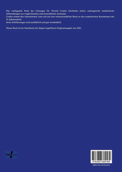 Das vorliegende Werk des Chirurgen Dr. Wenzel Gruber beinhaltet sieben umfangreiche medizinische Abhandlungen zur vergleichenden und menschlichen Anatomie.