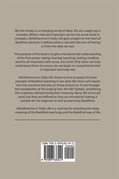Abhidhamma in Daily Life is an exposition of absolute realities in detail. Abhidhamma means higher doctrine and the book's purpose is to encourage the right application of Buddhism in order to eradicate wrong view and eventually all defilements. Many terms in P¿li, the language of early Buddhism, are used and are defined as they are introduced. The book is therefore suitable for beginners as well as more experienced Buddhists. It is detailed and precise and an invaluable aid to unlocking the deep meaning of the entire Buddhist Canon.