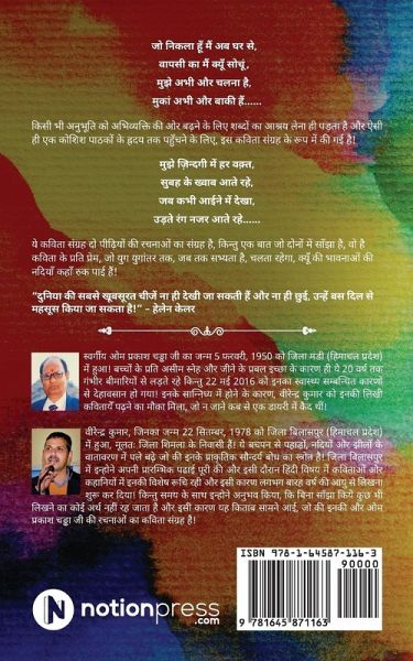 Jo nikla hun main ab ghar se, Wapsi ka main ab kyun sochun, Mujhe abhi aur chalna hai, Mukan abhi aur baki hain, Every feeling has to owe words to arrive an expression and such an effort has been made in the form of poetry collection to touch the heart of readers. Mujhe jindgi mein har waqt, Subah ke khwab aate rahe, Jab kabhi aaine mein dekha, Udte rang najar aate rahe... Abhivyakti -Zindagi Ke Pannon se, is a collection of Hindi Poetries of two generations, of which one belongs to 1950s and other 1980s. However, one thing is common to both the generations, that is the love for poetry and this will continue for ages till the existence of civilization since the spontaneous flow of the river of human feelings & emotions can never be stopped. The best and most beautiful things in the world cannot be seen or even touched - they must be felt with the heart. - Helen Keller
