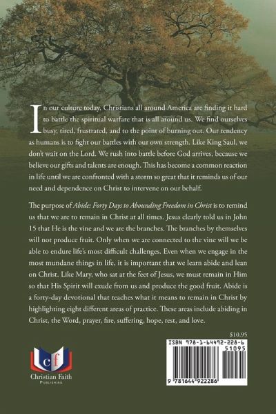 In our culture today, Christians all around America are finding it hard to battle the spiritual warfare that is all around us. We find ourselves busy, tired, frustrated, and to the point of burning out. Our tendency as humans is to fight our battles with our own strength. Like King Saul, we don't wait on the Lord. We rush into battle before God arrives, because we believe our gifts and talents are enough. This has become a common reaction in life until we are confronted with a storm so great that it reminds us of our need and dependence on Christ to intervene on our behalf. The purpose of Abide: Forty Days to Abounding Freedom in Christ is to remind us that we are to remain in Christ at all times. Jesus clearly told us in John 15 that He is the vine and we are the branches. The branches by themselves will not produce fruit. Only when we are connected to the vine will we be able to endure life's most difficult challenges. Even when we engage in the most mundane things in life, it is important that we learn abide and lean on Christ. Like Mary, who sat at the feet of Jesus, we must remain in Him so that His Spirit will exude from us and produce the good fruit. Abide is a forty-day devotional that teaches what it means to remain in Christ by highlighting eight different areas of practice. These areas include abiding in Christ, the Word, prayer, fire, suffering, hope, rest, and love.