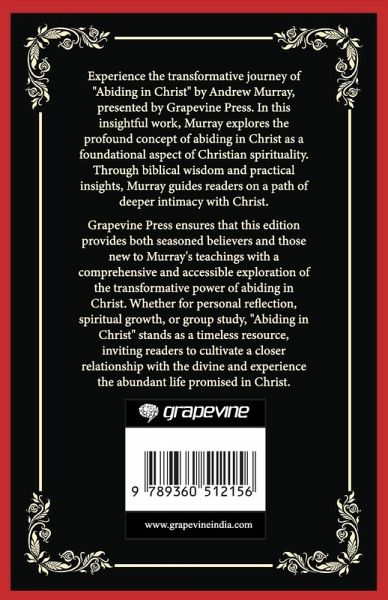 Experience the transformative journey of "Abiding in Christ" by Andrew Murray, presented by Grapevine Press. In this insightful work, Murray explores the profound concept of abiding in Christ as a foundational aspect of Christian spirituality. Through biblical wisdom and practical insights, Murray guides readers on a path of deeper intimacy with Christ. Grapevine Press ensures that this edition provides both seasoned believers and those new to Murray's teachings with a comprehensive and accessible exploration of the transformative power of abiding in Christ. Whether for personal reflection, spiritual growth, or group study, "Abiding in Christ" stands as a timeless resource, inviting readers to cultivate a closer relationship with the divine and experience the abundant life promised in Christ.
