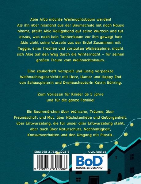 Abie Alba möchte Weihnachtsbaum werden! Als ihn aber niemand aus der Baumschule mit nach Hause nimmt, pfeift Abie Heiligabend auf seine Wurzeln und tut etwas, was noch kein Tannenbaum vor ihm gewagt hat: Abie zieht seine Wurzeln aus der Erde! Zusammen mit Teggie, einer frechen und vorlauten Winkelspinne, macht sich Abie auf den Weg durch die Winternacht - für seinen großen Traum vom Weihnachtsbaum.Eine zauberhaft verspielt und lustig verpackte Weihnachtsgeschichte mit Herz, Humor und Happy End von der Schauspielerin und Drehbuchautorin Katrin Bühring.Zum Vorlesen für Kinder ab 5 Jahren und für die ganze Familie!Ein Baummärchen über Wünsche, Träume, über Freundschaft und Mut, über Nächstenliebe und Geborgenheit, über Entwurzelung, die für unser aller Entwurzelung steht, aber auch über Naturschutz, Nachhaltigkeit, Konsumverhalten und den Umgang mit Plastik.
