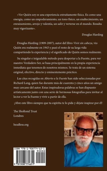 'Abierto a la Fuente' es una compilacio¿n global de los escritos que mejor transmiten el mensaje y el me¿todo de Douglas Harding. Esta amplia coleccio¿n, presentada con una serie de fotografi¿as exclusivas, proporciona al lector un acceso claro al estado de ser que Harding consideraba equivalente al Yo Mismo del vedanta y al no-yo del budismo. Lo que implica esta simple y maravillosa verdad es que, cuando nos vemos a nosotros mismos desde la perspectiva correcta, no somos lo que normalmente parecemos ser. Nuestra apariencia es claramente limitada, pero ¿lo estä tambie¿n nuestra realidad? Somos libres de alcanzar la comprensio¿n de nuestra naturaleza ilimitada ahora mismo, en este preciso instante; de nosotros depende.