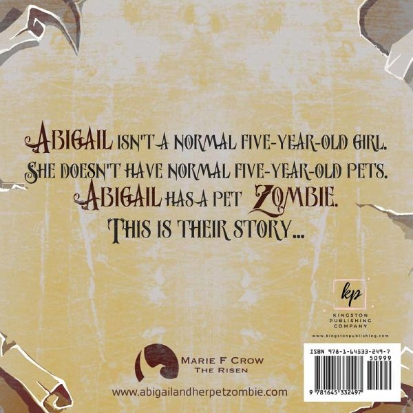 Abigail isn't a normal five year old girl. She doesn't have normal five year old pets. Abigail has a pet zombie. This is their story.... Author Biography - Marie F Crow weaves her stories around the human element of the horror verses the 'monsters' themselves. She believes that the real horror of life does not come from the expected, but from the unexpected responses of the human nature and what depths of trauma a person must survive in those situations. She began writing The Risen series when feeling that the popular genre was slipping too deep into the realm of pure 'slasher' and forgetting what the horror of 'zombies' can mean for a story. Now, with her children's series launched, Marie hopes to use her favorite 'monster' as a teaching tool to inspire children to understand that not everything that looks scary, is scary. With Abigail and Her Pet Zombie series, Marie hopes to further spread her love for all things 'that go bump in the night' with small children showing them that it's okay to be different and to embrace those same differences in those around them.