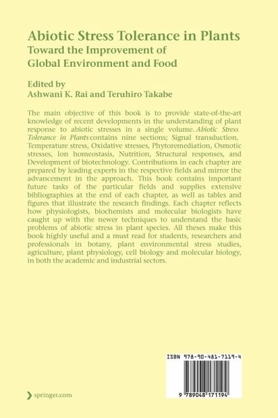 Stresses in plants caused by salt, drought, temperature, oxygen, and toxic compounds are the principal reason for reduction in crop yield. For example, high salinity in soils accounts for large decline in the yield of a wide variety of crops world over; ~1000 million ha of land is affected by soil salinity. Increased sunlight leads to the generation of reactive oxygen species, which damage the plant cells. The threat of global environment change makes it increasingly demanding to generate crop plants that could withstand such harsh conditions. Much progress has been made in the identification and characterization of the mechanisms that allow plants to tolerate abiotic stresses. The understanding of metabolic fluxes and the main constraints responsible for the production of compatible solutes and the identification of many transporters, collectively open the possibility of genetic engineering in crop plants with the concomitant improved stress tolerance. Abiotic Stress Tolerance in Plants is a new book with focus on how plants adapt to abiotic stress and how genetic engineering could improve the global environment and food supply. Especially, the application of biotechnology in Asia and Africa would be important. Environmental stress impact is not only on current crop species, but is also the paramount barrier to the introduction of crop plants into areas not currently being used for agriculture. Stresses are likely to enhance the severity of problems to be faced by plants in the near future.