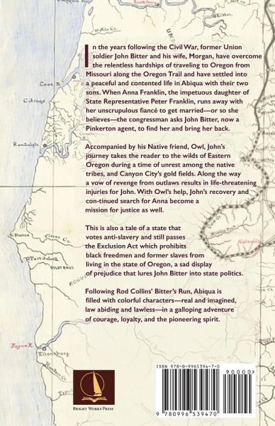 In the years following the Civil War, former Union soldier John Bitter and his wife, Morgan, have overcome the relentless hardships of traveling to Oregon from Missouri along the Oregon Trail and have settled into a peaceful and contented life in Abiqua with their two sons. When Anna Franklin, the impetuous daughter of State Representative Peter Franklin, runs away with her unscrupulous fiancé to get married-or so she believes-the congressman asks John Bitter, now a Pinkerton agent, to find her and bring her back. Accompanied by his Native friend, Owl, John's journey takes the reader to the wilds of Eastern Oregon during a time of unrest among the native tribes, and Canyon City's gold fields. Along the way a vow of revenge from outlaws results in life-threatening injuries for John. With Owl's help, John's recovery and continued search for Anna become a mission for justice as well. This is also a tale of a state that votes anti-slavery and still passes the Exclusion Act which prohibits black freedmen and former slaves from living in the state of Oregon, a sad display of prejudice that lures John Bitter into state politics. Following Rod Collins' Bitter's Run, Abiqua is ¿lled with colorful characters-real and imagined, law abiding and lawless-in a galloping adventure of courage, loyalty, and the pioneering spirit.