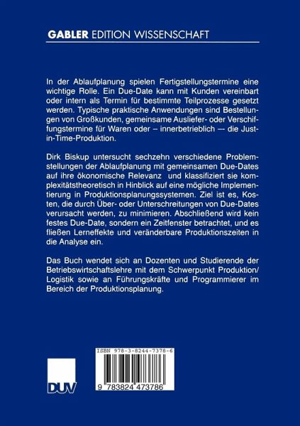 Dirk Biskup untersucht sechzehn verschiedene Problemstellungen der Ablaufplanung mit gemeinsamen Due-Dates auf ihre ökonomische Relevanz und klassifiziert sie komplexitätstheoretisch in Hinblick auf eine mögliche Implementierung in Produktionsplanungssystemen. Ziel ist es, Kosten, die durch Über- oder Unterschreitungen von Due-Dates verursacht werden, zu minimieren. Abschließend wird kein festes Due-Date, sondern ein Zeitfenster betrachtet, und es fließen Lerneffekte und veränderbare Produktionszeiten in die Analyse ein.