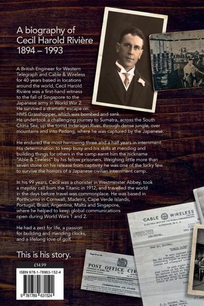 A British Engineer for Western Telegraph & Cable & Wireless for 40 years based in locations around the world, Cecil Harold Rivière was a first-hand witness to the fall of Singapore to the Japanese army in World War 2. He survived a dramatic escape on HMS Grasshopper, which was bombed & sank. He undertook a challenging journey to Sumatra, across the South China Sea, up the torrid Inderagiri River, through dense jungle, over mountains and into Padang, where he was captured by the Japanese. He endured the most harrowing three and a half years in internment. His determination to keep busy and his skills at mending and building things for others in the camp earnt him the nickname "Able & Tireless" by his fellow prisoners. Weighing little more than seven stone on his release from captivity he was one of the lucky few to survive the horrors of a Japanese civilian internment camp. In his 99 years, Cecil was a chorister in Westminster Abbey, took a mayday call from the Titanic in 1912, and travelled the world in the days before travel was commonplace. He was based in Porthcurno in Cornwall, Madeira, Cape Verde Islands, Portugal, Brazil, Argentina, Malta and Singapore, where he helped to keep global communications open during World Wars 1 and 2. He had a zest for life, a passion for building and mending clocks, and a lifelong love of golf. This is his story.