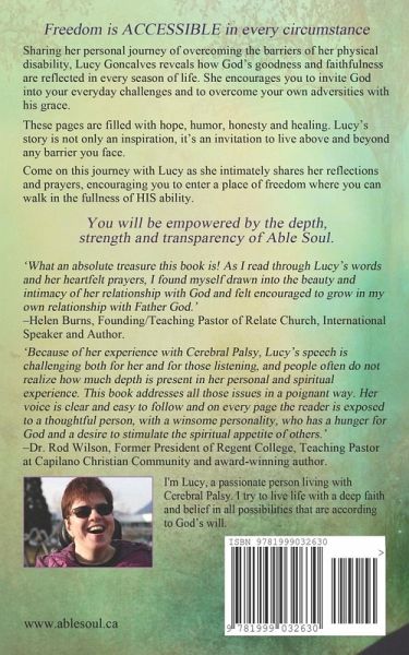 ¿ 2021 Christian Indie Award Winner - Christian Living category ¿ 2021 Pinnacle Book Achievement Award Winner - Spiritual category ¿ 2021 Book Excellence Award finalist - Inspirational category Imagine happiness was as easy as breathing. No stranger to adversity, Lucy Goncalves was deprived of oxygen at birth. She has lived her entire life with cerebral palsy, and the daily challenges she must face as a result. In her award-winning debut book Able Soul: Empowering God's Spirit Within, she explores the ground-breaking lessons garnered from embracing her struggles rather than giving up on God because of them. On the backdrop of personal stories from her life, along with related scriptures and prayers, you will find proof that the Holy Spirit is always accessible. God works with you in the midst of all your challenges. By inviting God's spirit in daily, Lucy has received tangible communications from God. She shares how the power of these soul-lifting reflections will lead you out of the darkness and steadfast toward pure contentment. If you're ready for true spiritual growth, join Lucy and discover the connection you need, in order to find the answers to your prayers. "He gives strength to the weary and increases the power of the weak." Isaiah 40:29 (NIV)
