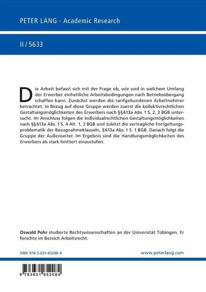 Die Arbeit befasst sich mit der Frage ob, wie und in welchem Umfang der Erwerber einheitliche Arbeitsbedingungen nach Betriebsübergang schaffen kann. Zunächst werden die tarifgebundenen Arbeitnehmer betrachtet. In Bezug auf diese Gruppe werden zuerst die kollektivrechtlichen Gestaltungsmöglichkeiten des Erwerbers nach