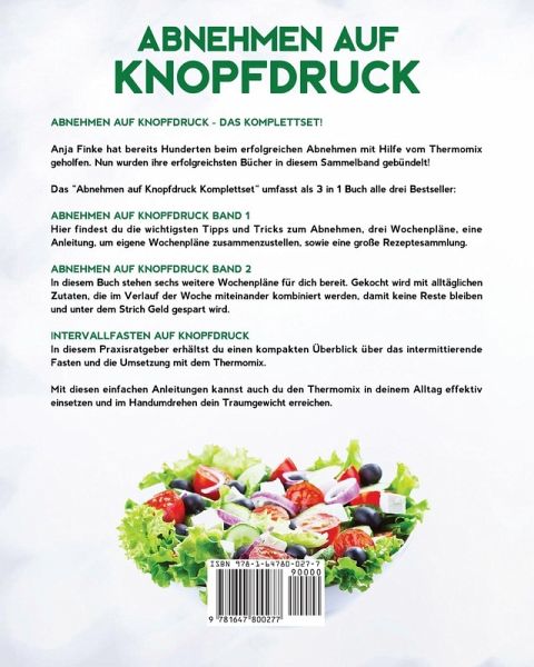 Anja Finke hat bereits Hunderten beim erfolgreichen Abnehmen mit Hilfe vom Thermomix geholfen. Nun hat sie ihr gebündeltes Wissen zu tagtäglichen Fragen rund ums Abnehmen zusammengefasst. Eine Pflichtlektüre für dich, wenn dir dein Abnehm-Vorhaben ernst ist oder du bisher vergeblich versucht hast mit Diäten abzunehmen. Denn ab sofort wird dir mit diesem Expertenratgeber die Lösung zu allen Abnehmproblemen auf dem Silbertablett serviert: Vorgefertigte Low Carb Wochenpläne für den Thermomix: Mit dieser Rezeptzusammenstellung kann nichts schief gehen: Über mehrere Wochen sind Frühstück, Mittag und Abendbrot sowie Snacks für dich vorgeplant. Kopiere diese simplen Anleitungen und nehme im Handumdrehen an Gewicht ab. Die besten Tipps und Tricks: In 30 Kapiteln rund um das Abnehmen mit dem Thermomix erklärt dir Anja Finke was wirklich funktioniert und welche fatalen Fehler du beim Abnehmen mit dem Thermomix unbedingt vermeiden musst. Lerne aus den Fehlern anderer und schlage mit diesem Buch die Abkürzung zum Wunschgewicht ein: Erfahre die Geheimformel gegen Heißhunger und wie du es schaffst dich dauerhaft zum Abnehmen zu motivieren. Gerichte zum Abnehmen: Du musst dir von nun an keine Rezepte mehr heraussuchen, mit welchen du Abnehmen kannst. Anja Finke das dies bereits übernommen und stellt dir über hundert Rezepte zur Verfügung – Leicht nachzukochen! Familien-Rezepte mit absoluter Chefkochgarantie: Wunderbare Gerichte, für die dich deine Familie und Gäste lieben werden. Mit optimaler Nährstoffzusammensetzung und einfachen Zutaten. Schmeckt auch den Kindern! Kein langes Suchen im Supermarkt: Herkömmliche Zutaten in den in Rezepten, kein Herumsuchen nach komplizierten Zutaten. Viele Hauptgerichte: Damit kannst du sicher und gut für deine Familie das Mittag- und Abendessen zubereiten, viele Auswahlmöglichkeiten! Für alle Lebenssituationen: Neben Hauptgerichten sind auch viele andere Rezeptkategorien im Buch: Du kannst also einfach deinen Tag planen. Du findest Rezepte aus den Kategorien Frühstück, Hauptgerichte, Suppen, Salate, Snacks, Smoothies, Brot und Aufstriche. Für deine Tagesplanung: Alle Rezepte haben die Dauer der Zubereitung angegeben: Gerade für Abnehmwillige wichtig, welche nebenbei noch Familie und Arbeit unter einen Hut bringen müssen. Mit Punkten: Erspar dir das lästige Nachrechnen von Punkten – Das wurde bereits erledigt. Die aktuellsten Punkte an jedem Rezept. Praxiserprobt und Qualitätsgeprüft: Diese Rezepte sind bewährt und du kannst sicher sein, dass sie auch bei dir zum Abnehmen funktionieren. Gratis E-Book: Mit dem Kauf erwirbst du als Bonus ein E-Book mit weiteren Rezepten Buch ist sofort verfügbar - Keine Wartezeit – Die Taschenbücher sind bei Amazon direkt versandbereit. Wort der Autorin: „Ich habe vor Jahren selbst mit Übergewicht zu kämpfen gehabt. Als Mutter zweier Kinder und meiner Berufstätigkeit blieb nicht viel Zeit für das gesunde Kochen. Mit dem Thermomix hatte sich dies geändert. Zubereitungsfunktionen wie der Varoma sind einfach nur genial und eignen sich wunderbar zum Abnehmen. Ich habe es mit dem Thermomix geschafft und teile seit 2015 meine wertvollen Erfahrungen" – Anja Finke