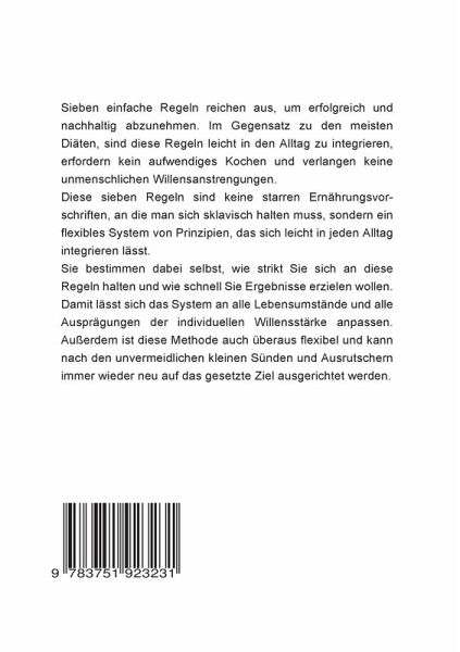 Sieben einfache Regeln reichen aus, um erfolgreich und nachhaltig abzunehmen. Im Gegensatz zu den meisten Diäten, sind diese Regeln leicht in den Alltag zu integrieren, erfordern kein aufwendiges Kochen und verlangen keine unmenschlichen Willensanstrengungen.Diese sieben Regeln sind keine starren Ernährungsvorschriften, an die man sich sklavisch halten muss, sondern ein flexibles System von Prinzipien, das sich leicht in jeden Alltag integrieren lässt.Sie bestimmen dabei selbst, wie strikt Sie sich an diese Regeln halten und wie schnell Sie Ergebnisse erzielen wollen. Damit lässt sich das System an alle Lebensumstände und alle Ausprägungen der individuellen Willensstärke anpassen. Außerdem ist diese Methode auch überaus flexibel und kann nach den unvermeidlichen kleinen Sünden und Ausrutschern immer wieder neu auf das gesetzte Ziel ausgerichtet werden.