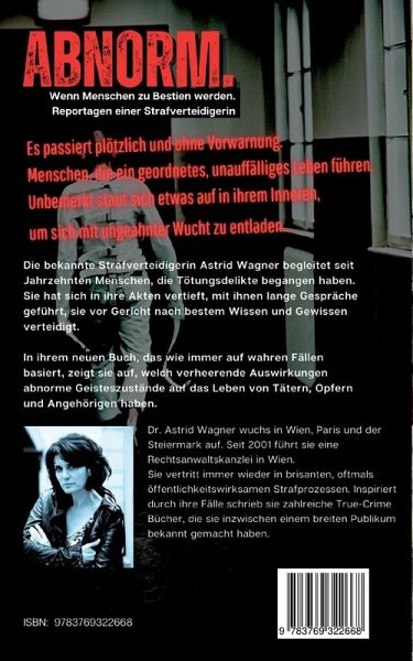 Es passiert plötzlich und ohne Vorwarnung. Menschen, die ein geordnetes, unauffälliges Leben führen. Unbemerkt staut sich etwas auf in ihrem Inneren, um sich mit ungeahnter Wucht zu entladen. Die bekannte Strafverteidigerin Astrid Wagner begleitet seit Jahrzehnten Menschen, die Tötungsdelikte begangen haben. Sie hat sich in ihre Akten vertieft, mit ihnen lange Gespräche geführt, sie vor Gericht nach bestem Wissen und Gewissen verteidigt. In ihrem neuen Buch, das wie immer auf wahren Fällen basiert, zeigt sie auf, welch verheerende Auswirkungen abnorme Geisteszustände auf das Leben von Tätern, Opfern und Angehörigen haben.