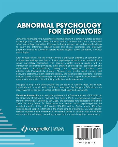 Abnormal Psychology for Educators presents students with a carefully curated selection of readings that consider childhood mental health conditions from both a clinical and school psychology perspective. Exposure to diverse perspectives and approaches helps to clarify the differences between school and clinical psychology and effectively prepares students for successful careers as psychologists, school counselors, or school psychologists. Each chapter within the text centers around a particular diagnosis or condition and includes two readings, one from a clinical psychology perspective and another from a school psychology perspective. The opening chapter provides readers with an introduction to abnormal psychology. Later chapters address special education law and school-based accommodations, anxiety and depressive disorders, and attention-deficit/hyperactivity disorder. Students read articles about conduct and behavioral problems, autism spectrum disorder, and trauma-related disorders. The final chapter speaks to obsessive-compulsive disorders. Each chapter includes discussion questions to stimulate critical thinking, reflection, and conversation. Designed to help future psychologists and counselors to identify, treat, and support individuals with mental health conditions, Abnormal Psychology for Educators is an ideal resource for courses in school-centered psychology and counseling. Katherine Stavropoulos is an assistant professor in the Graduate School of Education at the University of California, Riverside. She holds a Ph.D. in experimental psychology from the University of California, San Diego, and completed her postdoctoral work at the Yale Child Study Center. Dr. Stavropoulos is a licensed clinical psychologist and the assistant director of the UC Riverside SEARCH Autism Center, which offers free screenings and support to families in the Inland Empire of California. Dr. Stavropoulos' research explores neural correlates of the reward system in children with and without autism spectrum disorders, as well as broader topics in social cognitive neuroscience.