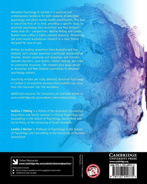 Abnormal Psychology in Context is a practical and contemporary handbook for both students of abnormal psychology and allied mental health practitioners. This text is one of the first of its kind, providing a specific focus on abnormal psychology from Australian and New Zealand - rather than US - perspectives. Nadine Pelling and Lorelle Burton have crafted a highly relevant resource, showcasing the most recent Australasian research in a clear format designed for ease of use. Written by leading researchers from Australia and New Zealand, each chapter examines a particular psychological disorder, details symptoms and responses, and includes relevant statistics, case studies, further reading and links to community resources. The chapters give equal weight to Australian and New Zealand experiences in abnormal psychology matters. Succinctly written yet richly detailed, Abnormal Psychology in Context is an essential resource that students can carry from the classroom into the workplace.