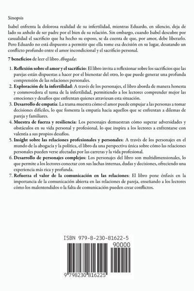 Sinopsis Isabel enfrenta la dolorosa realidad de su infertilidad, mientras Eduardo, en silencio, deja de lado su anhelo de ser padre por el bien de su relación. Sin embargo, cuando Isabel descubre por casualidad el sacrificio que ha hecho su esposo, se da cuenta de que, por amor, debe liberarlo. Pero Eduardo no está dispuesto a permitir que ella tome esa decisión en su lugar, desatando un conflicto profundo entre el amor incondicional y el sacrificio personal. 7 beneficios de leer el libro Abogada:Reflexión sobre el amor y el sacrificio: El libro invita a reflexionar sobre los sacrificios que las parejas están dispuestas a hacer por el bienestar del otro, lo que puede generar una profunda comprensión de las relaciones personales. Exploración de la infertilidad: A través de los personajes, el libro aborda de manera honesta y conmovedora el tema de la infertilidad, permitiendo a los lectores comprender mejor las emociones y desafíos que enfrentan quienes atraviesan esta situación. Desarrollo de empatía: La trama muestra cómo el amor puede empujar a las personas a tomar decisiones difíciles, lo que fomenta la empatía hacia aquellos que se enfrentan a dilemas de pareja y familiares. Muestra de fuerza y resiliencia: Los personajes demuestran cómo superar adversidades y obstáculos en su vida personal y profesional, lo que inspira a los lectores a enfrentarse con valentía a sus propios desafíos. Insight sobre las relaciones profesionales y personales: A través de los personajes en el mundo de la abogacía y la política, el libro da una perspectiva única sobre cómo las relaciones personales pueden verse afectadas por las carreras y la vida profesional. Desarrollo de personajes complejos: Los personajes del libro son multidimensionales, lo que permite a los lectores conectar con sus luchas internas, dudas y decisiones, ofreciendo una experiencia más rica y profunda. Refuerza el valor de la comunicación en las relaciones: El libro pone énfasis en la importancia de la comunicación abierta en las relaciones de pareja, enseñando a los lectores cómo los malentendidos o la falta de comunicación pueden crear conflictos.