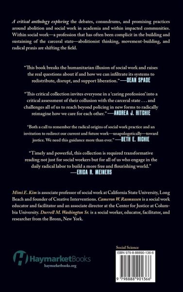 Mimi E. Kim is assistant professor of social work at California State University, Long Beach and founder of Creative Interventions. Kim continues her political work through promotion of transformative justice and abolitionist visions and practices of community care and safety. Cameron Rasmussen is a social worker, educator and facilitator. He is an Associate Director at the Center for Justice at Columbia University, a lecturer at Columbia Social Work, a PhD student at the Graduate Center, and a Collaborator with the NAASW. Durrell M. Washington is an author, social worker, educator, facilitator, and socio-legal scholar from the Bronx, New York. He is a collaborator with the Network to Advance Abolitionist Social Work and PhD Candidate at the University of Chicago.