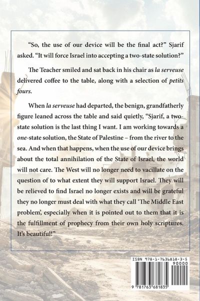 When the analysis departments of the CIA, Germany's BND and Britain's MI5 and MI6 began noticing fragmentary and vague references to an unspecified major Islamist terrorist attack, information analysts around the world were put on high alert, trying to piece together the cryptic chatter in an attempt to determine the nature and planned target of the terrorist attack. It was, however, a Cambridge university professor specializing in religious diversity and jihadist law who was able to draw the threads together, revealing a planned nuclear detonation on the Temple Mount in Jerusalem by a terrorist group known as the Islamic Jihad Union. It then falls to Mossad and to the Israeli domestic intelligence service, Shin Bet, to find the nuclear device before it can be reassembled and detonated, and to hunt down the leaders of IJU. One of the most sought-after men is the head of IJU and its financier - a shadowy figure known only by the pseudonym he uses, 'The Teacher'. Mossad's Chief of Special Ops, Reuben Stern, leads a small team hunting down The Teacher and his trusted lieutenant, Sjarif bin Hammadi, while Benjamin Rosen, the Director of Shin Bet, manages the search within Israel for IJU operatives and for the nuclear device. Both men knew that failure on their part would lead to the State of Israel being erased from the map. "So, this will be the final act?" Khalil asked. "It will force Israel into accepting a two-state solution?" The old man smiled and sat back in his chair as la serveuse delivered their coffee, along with desserts which he had ordered without consulting his guest. When la serveuse had departed, the grandfatherly figure leaned across the table and said quietly, "Khalil, a two-state solution is the last thing I want. I am working toward a one-state solution, the state of Palestine - from the river to the sea. And when that happens, when the use of our device brings about the total annihilation of the state of Israel, the world will not care. The West will no longer need to vacillate on the question as to what extent they will support Israel. They will be relieved Israel no longer exists and that they no longer must deal with what they call 'The Middle East Problem', especially when it is made clear to them that it is the fulfilment of prophecy from their own holy scriptures. It's beautiful!"